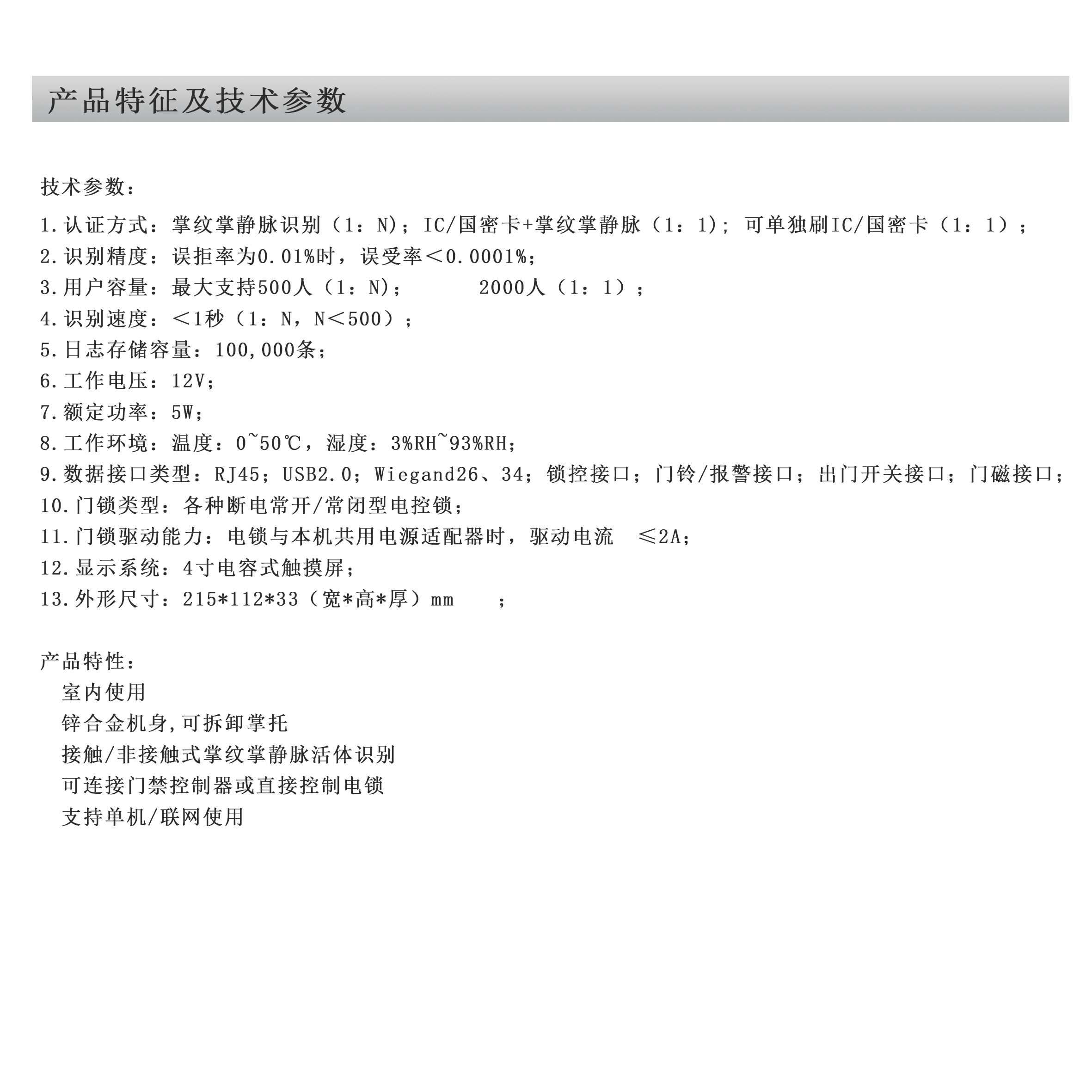 E101a(擴展型)為(wèi)最新一(yī)代掌紋掌靜(jìng)脈識别産÷∑✘♥品。産品可(kě)室內(nèi)使用(yòng);最大(dà)支持500人(r☆αén)(1:N),2000人(rén)(1:1);識别速度<1秒(miǎoφ≠);認證方式:刷手掌、刷IC/國(guó)密卡、刷IC/α×✘σ國(guó)密卡+手掌;産品采用(yòng)鋅合金(jīn)金(jīn)屬外(wài)殼,可(k←₩ě)摘卸式掌托适合于不(bù)同環境下(xià)的(de)應用(yòng)需求;多(duō)種↑✘→設計(jì)接口方便産品集成到(dào)不(bù)同的(de)系統解決方案。