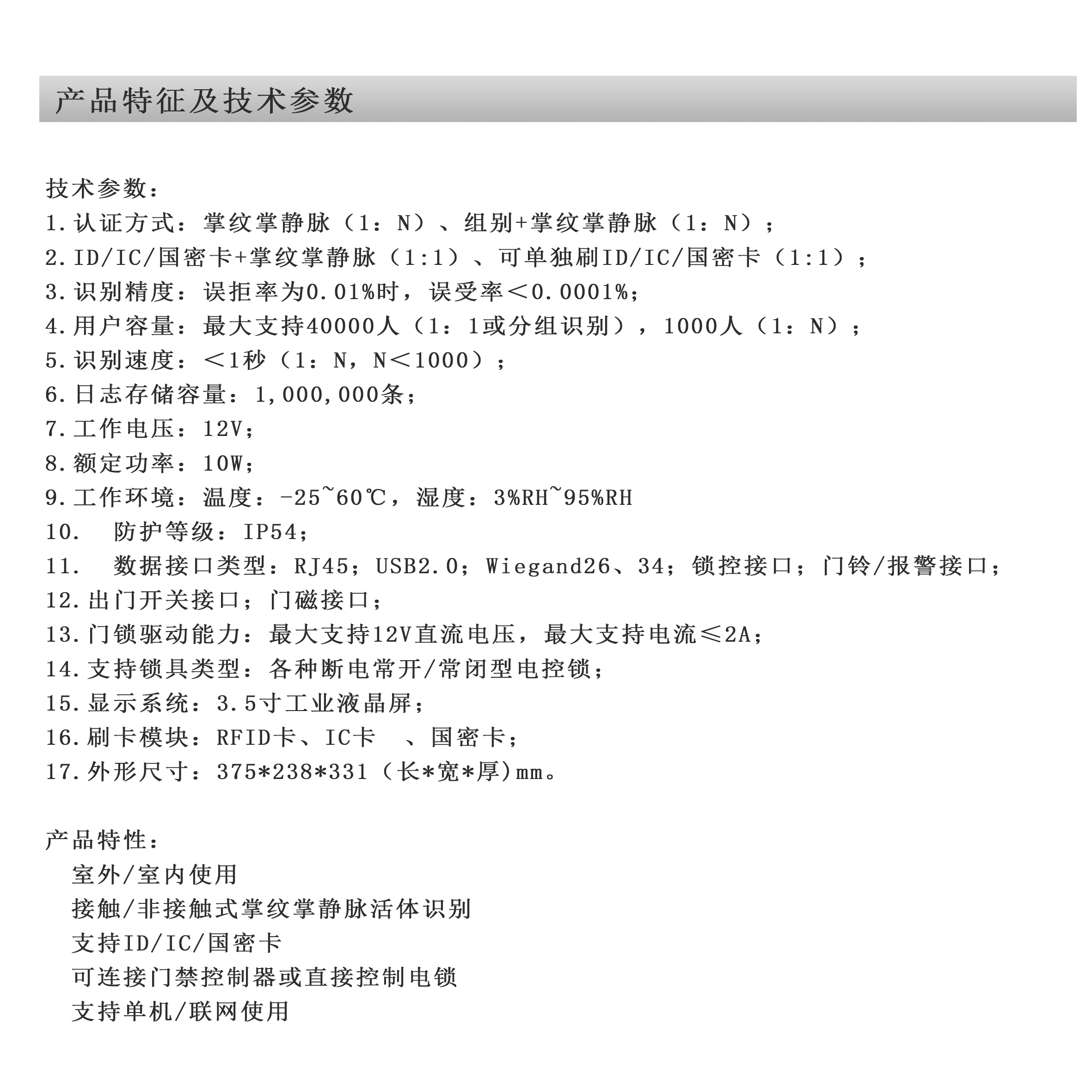 B04是(shì)掌紋掌靜(jìng)脈識别系列的(de)拳頭産品。産品支持純戶外(wài)使用α↔←(yòng);最大(dà)支持1000人(rén)(1​α ¶:N),40000人(rén)(1:1,可(kě)擴展),識别速度&≤ε ¥lt;1秒(miǎo);認證方式可(kě)以刷手掌、刷卡、卡+刷手掌、卡或刷手掌、分("★"fēn)組+刷手掌等;産品可(kě)廣泛應用(yòng)于監獄、銀(y"≥¶ín)行(xíng)、政府、企事(shì)業(yè)單位等高(gā≤ γ¥o)端安保體(tǐ)系;多(duō)種設計(jì)接口方便産品集成到(dào)不(bù)同的(d☆€e)系統解決方案。